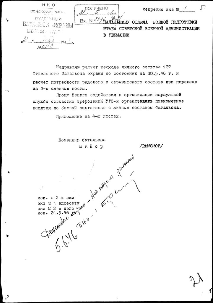 Одновременно майор Рамонов направил начальнику Отдела боевой подготовки расчет расхода личного состава 137 обо. По состоянию на 30 мая 1946 г. 137 обо при имеющемся некомплекте 59 человек должен был ежедневно выставлять четыре гарнизонных караула, постоянный наряд по комендатуре и внутренний наряд. Из-за нехватки людей большинство постов в караулах были двухсменными, но даже при таком раскладе 52 человека вынуждены были стоять без смены. При переходе же на трехсменные посты по расчетам Рамонова положение еще более усугублялось, поскольку в этом случае количество стоящих без смены бойцов возрастало до 146 человек. Говорить в такой ситуации о какой-либо боевой учебе не имело смысла. Поэтому Рамонов в сопроводительной записке, приложенной к расчетам, просил «содействия в организации караульной службы согласно требований УГС и организовать планомерные занятия по боевой подготовке с личным составом батальона».11