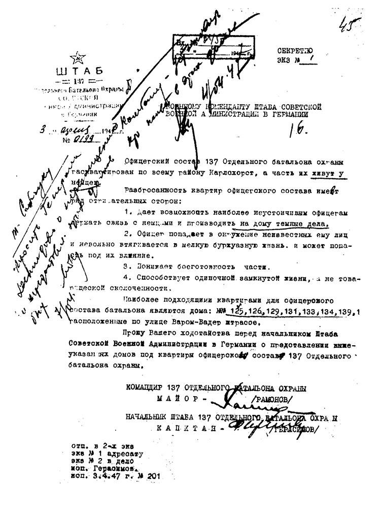 Однако командование 137 обо задолго до появления этих директив пыталось решить возникшую жилищную проблему. Еще 3 апреля 1947 г. командир 137 обо майор Х. Т. Рамонов в своей докладной записке сообщал военному коменданту Штаба СВАГ полковнику С. С. Максимову,37 что офицерский состав батальона расквартирован по всему району Карлсхорст, а часть офицеров проживает у немцев. По мнению Рамонова разбросанность квартир офицерского состава снижала боеготовность батальона, а проживание офицеров среди немцев отрицательно сказывалось на моральной стойкости некоторых из них. Поэтому комбат просил полковника Максимова ходатайствовать перед вышестоящим командованием о предоставлении в распоряжение 137 обо нескольких домов, расположенных на ближайшей к батальону улице Вармбадер штрассе (нынешняя Роберт-Зиверт-штрассе – В. Т.).