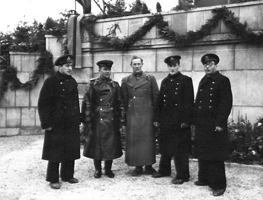 | (38 из 38) Авторы памятника скульпторы Л. Е. Кербель (крайний слева) и В. Е. Цигаль (второй справа). Второй слева – начальник 23 УВПС инженер-подполковник Р. И. Буравцев. В пилотке предположительно архитектор Н. И. Дубровин. Из архива К. А. Беручан. © |